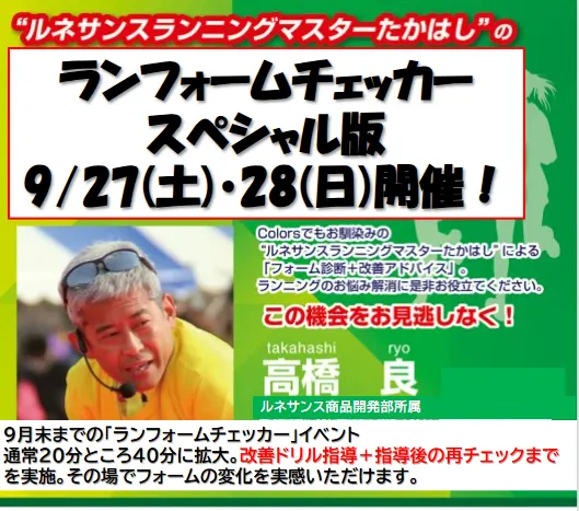 直前の告知ではありますが、終了目前の9/27(土)・28(日)両国クラブにて”ランニングマスターたかはし”が責任担当にて「RUNフォームチェッカー・スペシャル版」を開催します!!