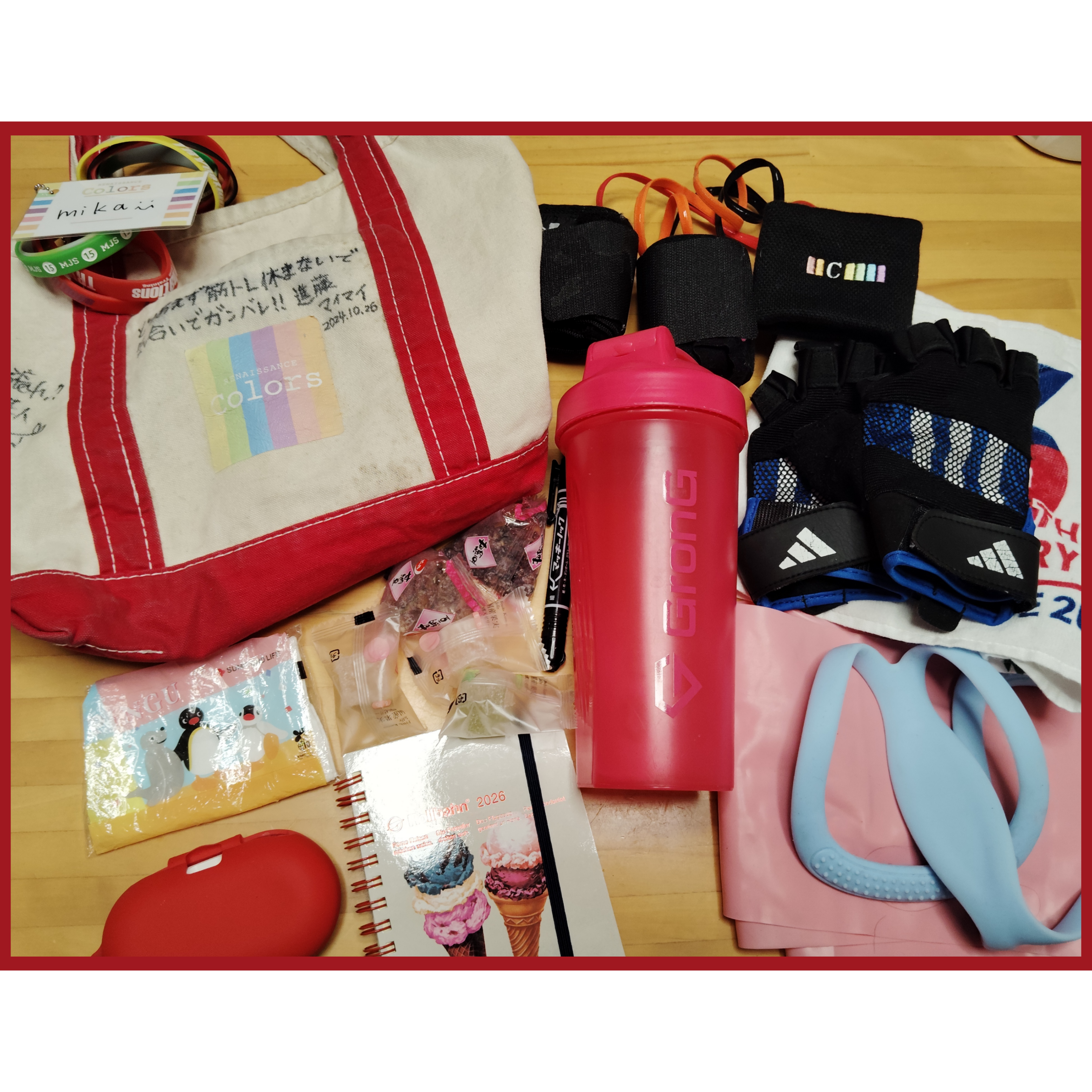 Colorsリストバンド、タオル、筆記用具、パーソナル用のノート、ティッシュ、イヤホン、カーボ補給おやつ