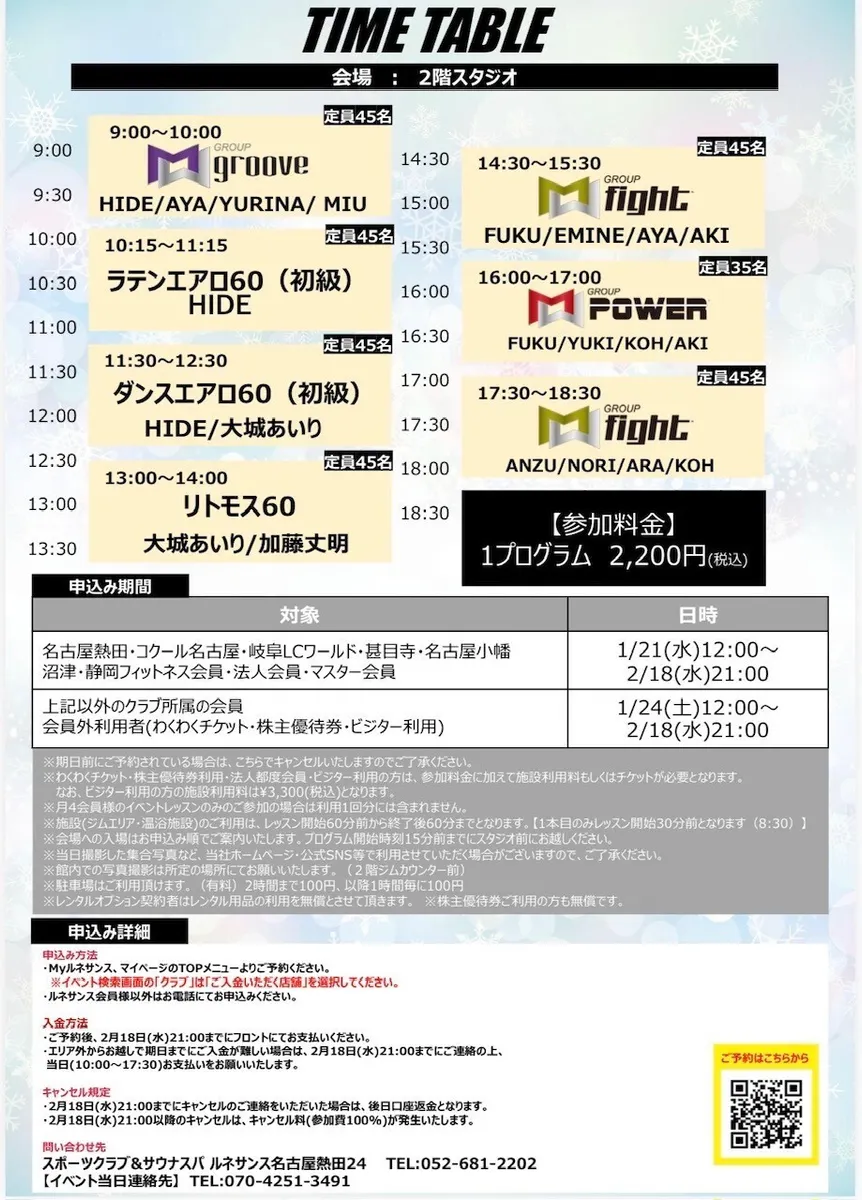 ・Myルネサンスアプリ内「マイページ」の「各種予約メニュー」→「イベント検索」よりお申込みください。(予約方法・詳細はこちら)