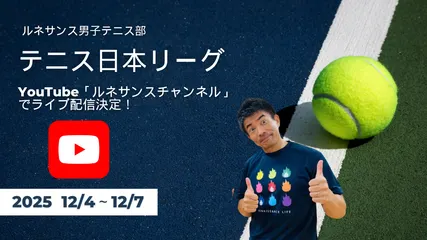 【ルネサンスチャンネル】実業団ルネサンス男子テニスチームの試合をライブ配信決定! ルネチューバーのFUKUです! 12月4日~7日は全力でルネサンス男子テニスチームを応援しましょう(^^)/ 悲願の日本最高峰「テニス日本リーグ」での闘い、必見です(^^)/関連記事あと一歩…それでも17年挑み続けたテニス実業団の根底にある想い|ルネサンス公式note