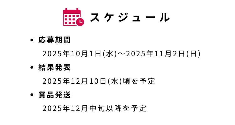 ・賞品の発送は応募時に登録いただいた情報をもとに行います。不備がある場合、賞品をお届けできない可能性があります。